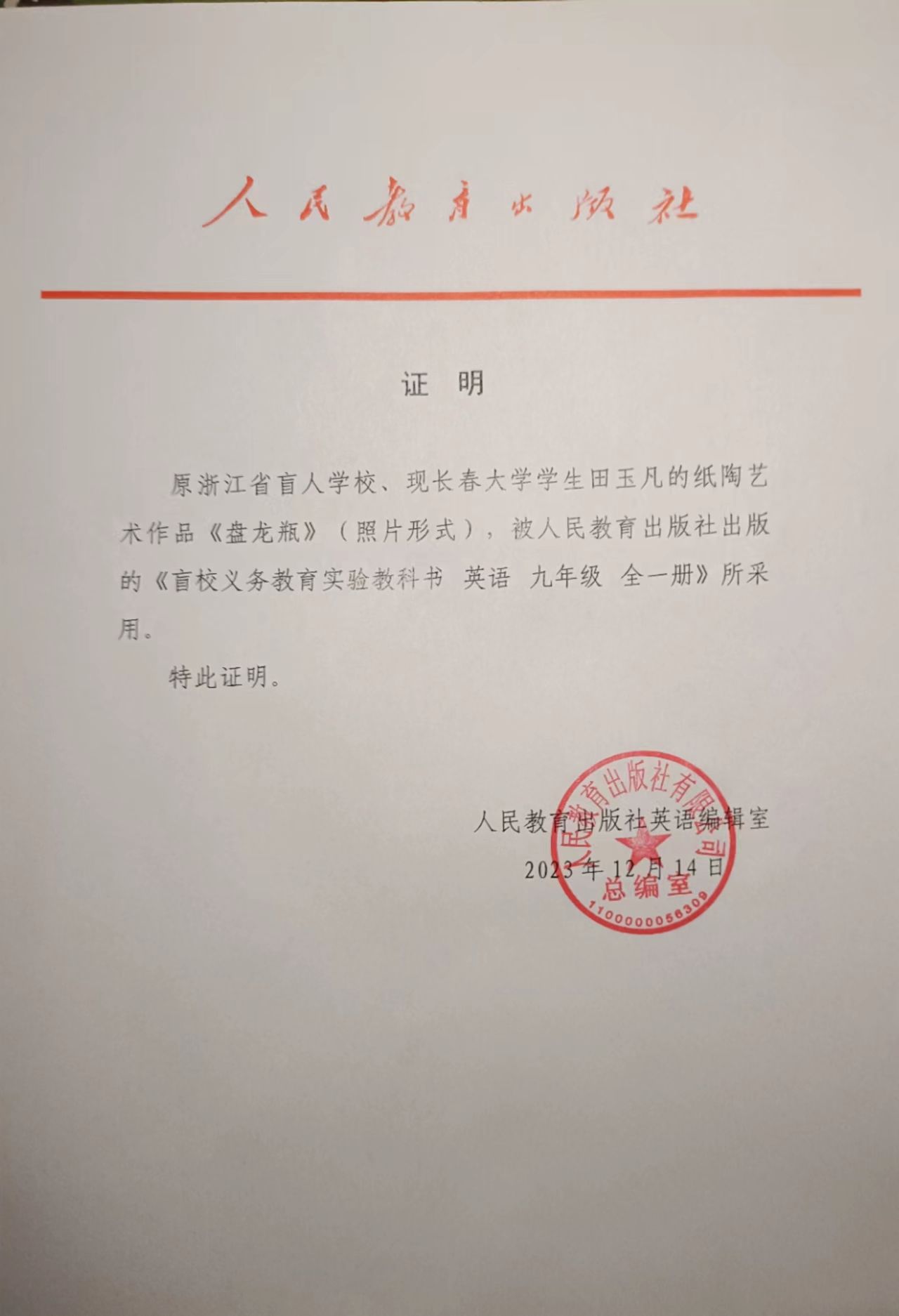 近日,我校特殊教育學(xué)院針灸推拿學(xué)專業(yè)22502班視障學(xué)生田玉凡利用廢舊盲文紙創(chuàng)作出的紙?zhí)账囆g(shù)作品《盤(pán)龍瓶》,被人民教育出版社出版的《盲校義務(wù)教育實(shí)驗(yàn)教科書(shū)英語(yǔ)九年級(jí)全一冊(cè)》采用。