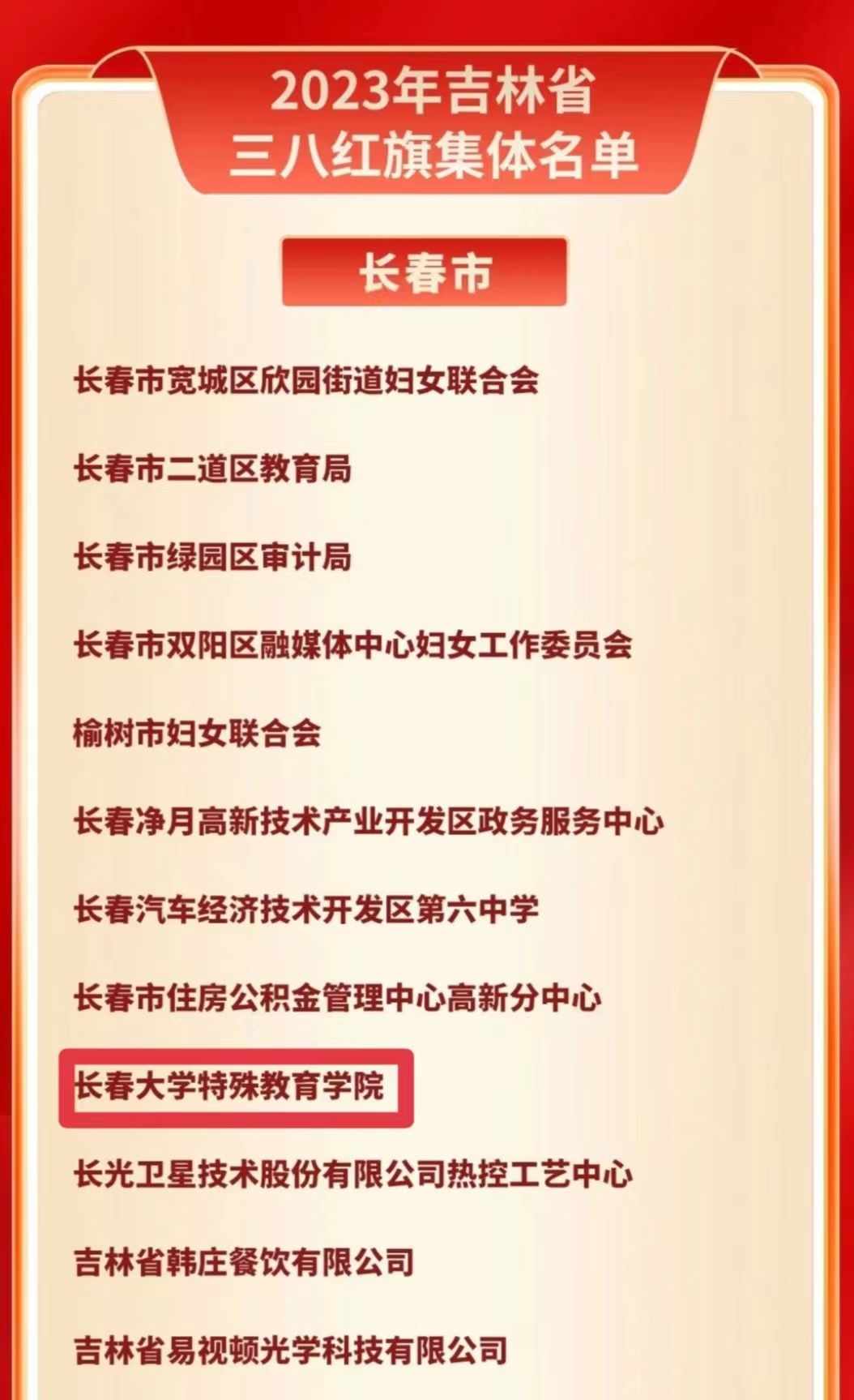 近日,吉林省婦女聯合會、長春市婦女聯合會等單位相繼發布了表彰決定,我校女教工集體和個人獲得表彰。其中,特殊教育學院獲評“吉林省三八紅旗集體”稱號,特殊教育學院教師孫晶華獲評“長春市三八紅旗手”稱號,電子信息工程學院教師王曉麗的家庭被命名為2023年長春市“最美家庭”。