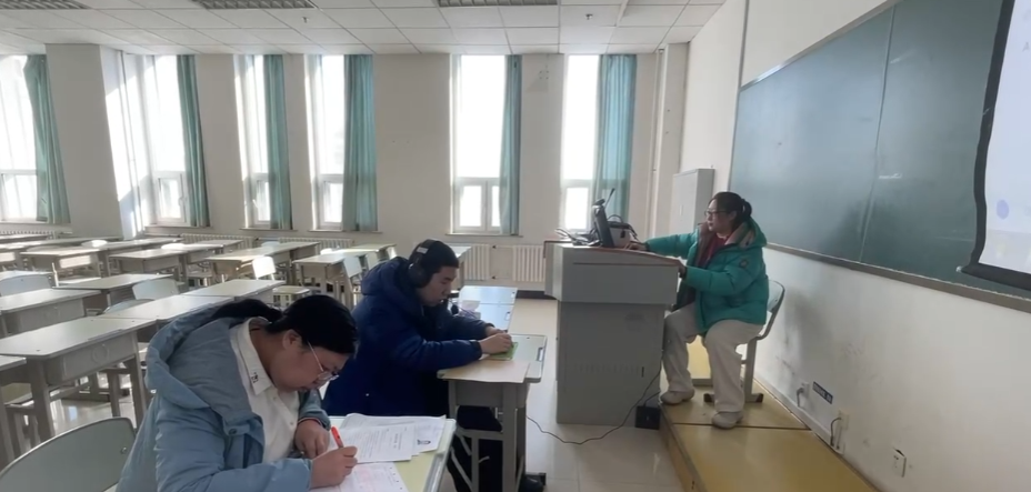 省教育考試院在2022-2023年期間先后兩次來我校對考試形式進行反復研究、測試,最終為視障考生提供了有聲試卷。兩名監考教師一人代寫一人操作考試系統。