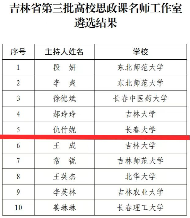 近日,吉林省教育廳開展了第三批高校思政課名師工作室遴選工作,經各高校申報、專家評分、網絡公示等環節,評選出10個吉林省高校思政課名師工作室。我校馬克思主義學院教師仇竹妮申報的“辰·輝”工作室入選吉林省高校思政課名師工作室。